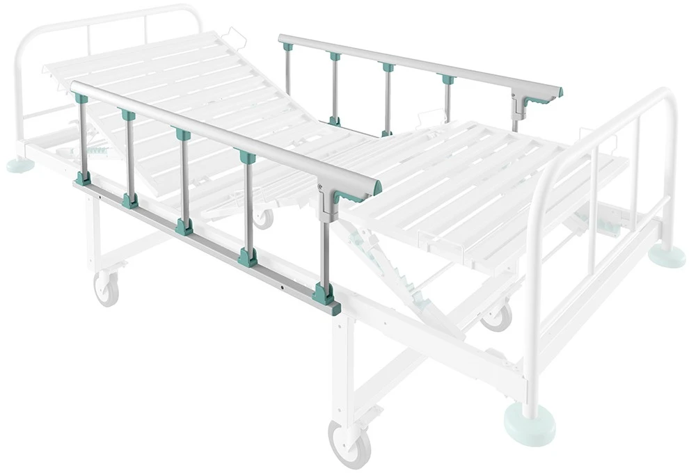 - Спинки в изголовье и ногах кровати – съёмные, изготовлены из ударопрочного пластика, устойчивого к износу. Отличаются скруглёнными краями и углами, защищающими пациента от травм.