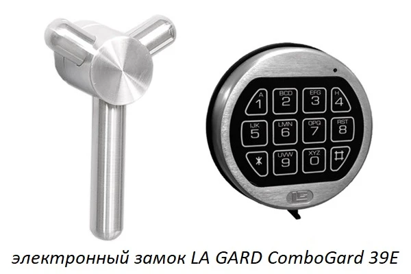 - На дверь установлен американский электронный замок «ComboGard Pro 39 E», обладающий высоким классом секретности. Замок защищён от подбора кода и допускает до миллиона кодовых комбинаций.