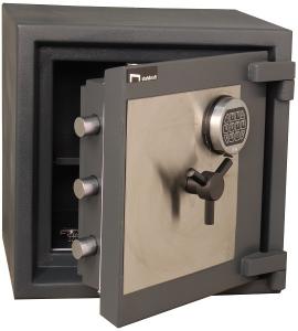 - Запирается сейф электронным немецким замком Wittkopp высокого уровня секретности. Замок активирует трёхстороннюю систему ригелей, снабжённую механизмом аварийной блокировки с применением калёного стекла, который жёстко фиксирует выдвинутые ригели при любой попытке силового вскрытия сейфа.