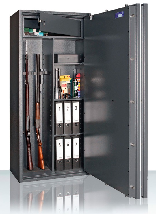 - Имеется просторное отделение для патронов с внутренними размерами (ВхШхГ) 196х541х263 мм и ключевым замком.